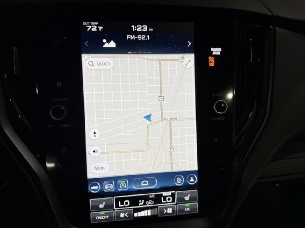 Power Moonroof & Navigation & RAB (Power Moonroof, Radio: Subaru STARLINK 11.6" Multimedia Nav System, and Reverse Automatic Braking (RAB) System), 4-Wheel Disc Brakes, 4.444 Axle Ratio, 6 Speakers, ABS brakes, Air Conditioning, Alloy wheels, AM/FM radio: SiriusXM, Auto High-beam Headlights, Auto-Dimming Exterior Mirror w/Approach Light, Auto-dimming Rear-View mirror, Automatic temperature control, Brake assist, Compass, Driver door bin, Driver vanity mirror, Dual front impact airbags, Dual front side impact airbags, Electronic Stability Control, Emergency communication system: STARLINK Safety Plus (3-year free trial), Exterior Parking Camera Rear, Four wheel independent suspension, Front anti-roll bar, Front Bucket Seats, Front Center Armrest w/Storage, Front dual zone A/C, Front fog lights, Front reading lights, Fully automatic headlights, Garage door transmitter: HomeLink, Heated door mirrors, Heated Front Bucket Seats, Heated front seats, Heated rear seats, Illuminated entry, Knee airbag, Leather steering wheel, Low tire pressure warning, Navigation System, Occupant sensing airbag, Outside temperature display, Overhead airbag, Overhead console, Panic alarm, Passenger door bin, Passenger vanity mirror, Power door mirrors, Power driver seat, Power Liftgate, Power passenger seat, Power steering, Power windows, Radio: Subaru STARLINK 11.6" Multimedia Plus Sys, Rear anti-roll bar, Rear Seat Back Protector, Rear seat center armrest, Rear window defroster, Rear window wiper, Remote keyless entry, Roof rack, Security system, Speed control, Speed-sensing steering, Splash Guards, Split folding rear seat, Spoiler, StarTex-Trimmed Upholstery, Steering wheel mounted audio controls, Steering Wheel Paddle Shift Control Switches, Tachometer, Telescoping steering wheel, Tilt steering wheel, Traction control, Trip computer, Turn signal indicator mirrors, Variably intermittent wipers, and Wheels: 17" x 7J Black Aluminum Alloy.